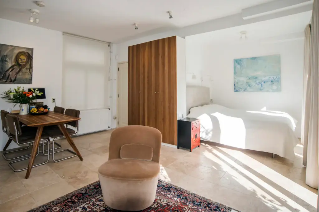This is a very privat ground floor studioapartment( so no steep stairs) with your own privatgarden , in the peaceful so called backhouse of our canalhouse at the Amstel river. extremely central yet very quiet. A privat marble bathroom/ toillet, privat kitchen+ privat (Miele) washingmachine / dryer(etc.).2 minutes away from Central Station( subway), 9 minutes from World Trade center(subway). The subway entrance is 2 minutes